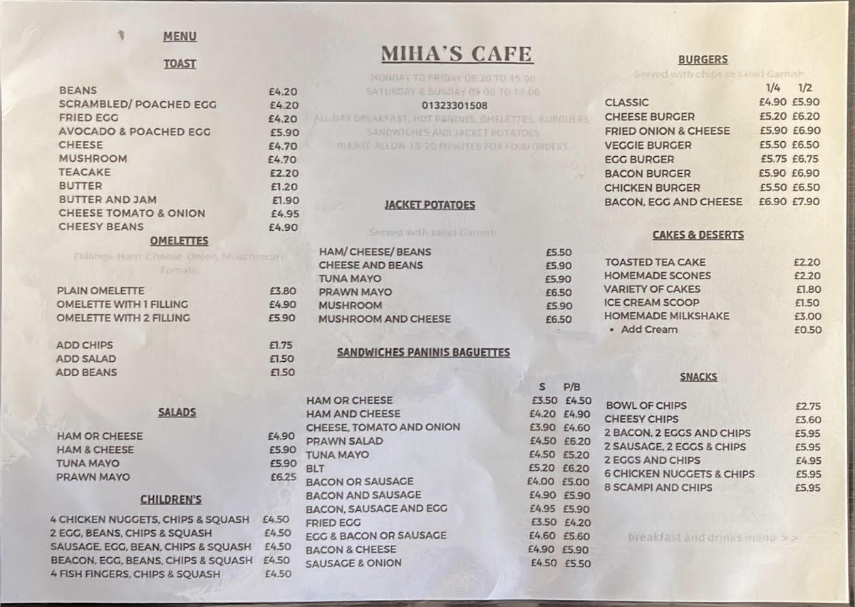 Welcome to Miha’s Cafe, a delightful eatery nestled at 20 The Broadway, Eastbourne. This charming cafe boasts a diverse menu that caters to all tastes, making it a local favorite. The offerings range from hearty snacks like Bowl of Chips and Chicken Nuggets to a selection of mouth-watering burgers, including classic favorites like the Cheese Burger and the unique Veggie Burger.